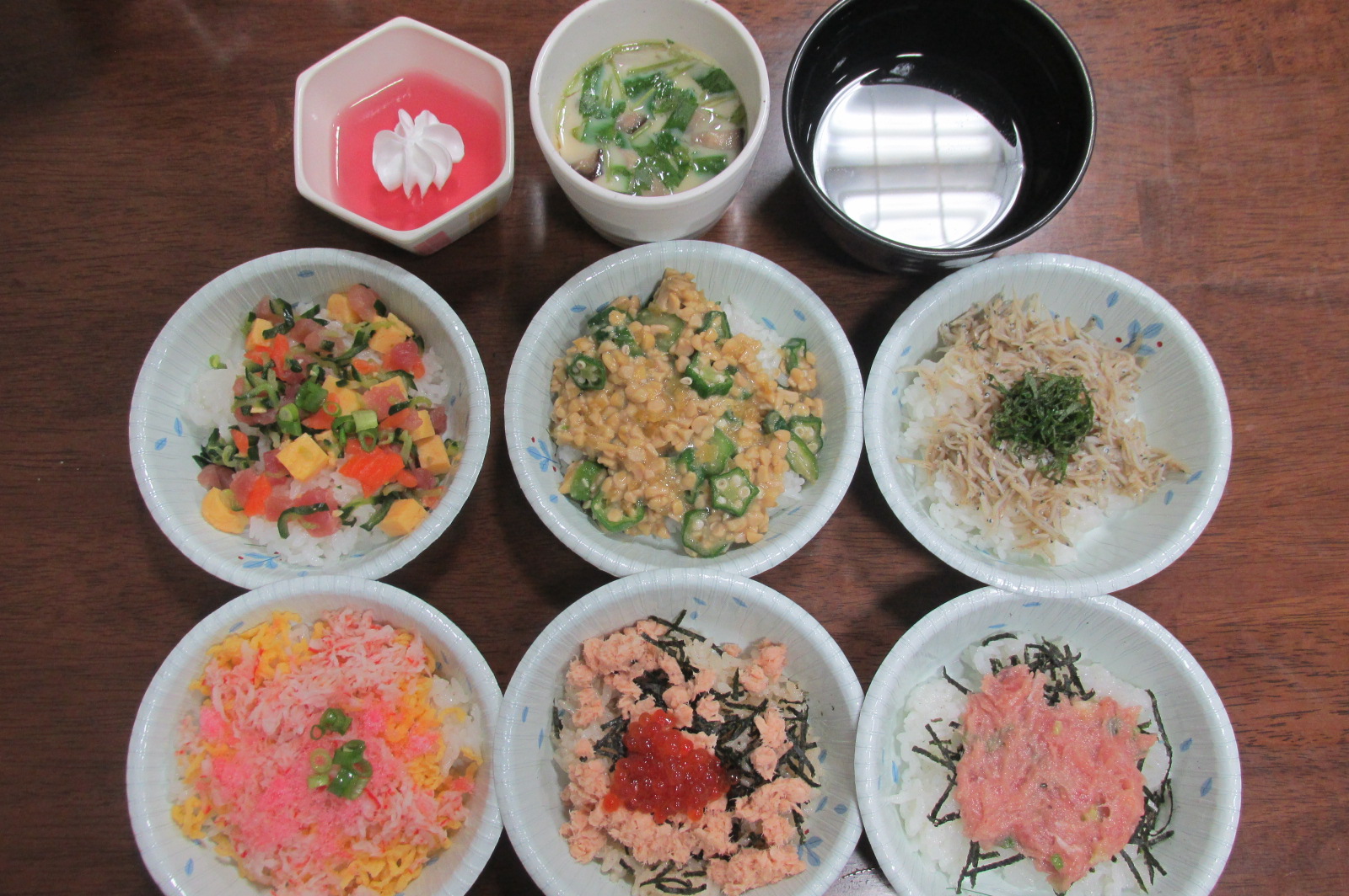6種類のミニ丼(ばらちらし、納豆丼、しらす丼、かにちらし、はらこ丼、ねぎとろ丼)の中から 2種類ずつ選んで頂きました。